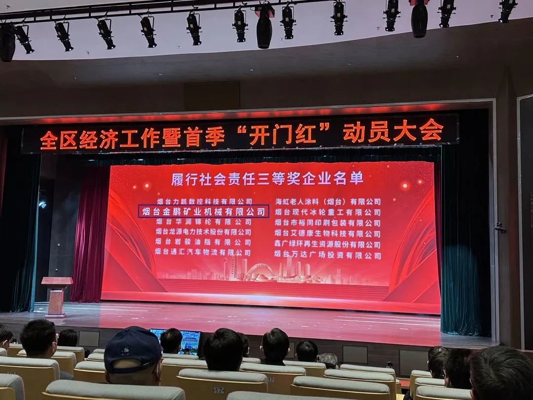 1月29日上午,煙臺黃渤海新區全區經濟工作暨首季“開門紅”動員大會在美麗的八角灣會展中心隆重舉行。會上,金鵬礦機被評為“履行社會責任三等獎企業”,許慶硯總經理獲頒“2022年度履行社會責任優秀企業家”榮譽稱號。