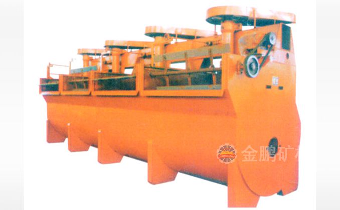 該浮選機工作時,隨著葉輪的旋轉(zhuǎn),槽內(nèi)礦漿從四周經(jīng)槽底由葉輪下端吸到葉輪葉片之間由鼓風(fēng)機給入的低壓空氣經(jīng)空心軸和葉輪腔的空氣分配器,也進入其中。礦漿與空氣在葉片之間充分混合后,從葉輪上半部周邊向斜上方推出,由定子升穩(wěn)流和定向后進入整個槽子中。氣泡上升到泡沫穩(wěn)定區(qū),礦化富集后,自溢流堰溢出。另一部分礦漿向葉輪下部流去,再經(jīng)攪拌,重新混合形成礦化氣泡。剩余的礦漿流向下一槽直至最終成尾礦。